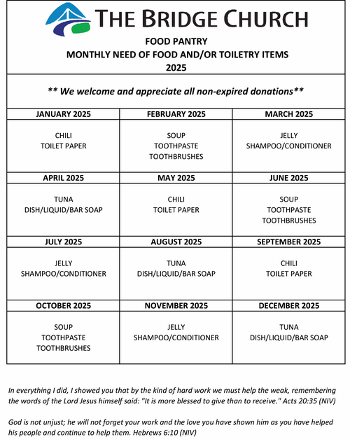 Our food pantry is 100% volunteer run and purchased food is funded through The Bridge Community Partnership Fund, along with the wish list donation calendar below.